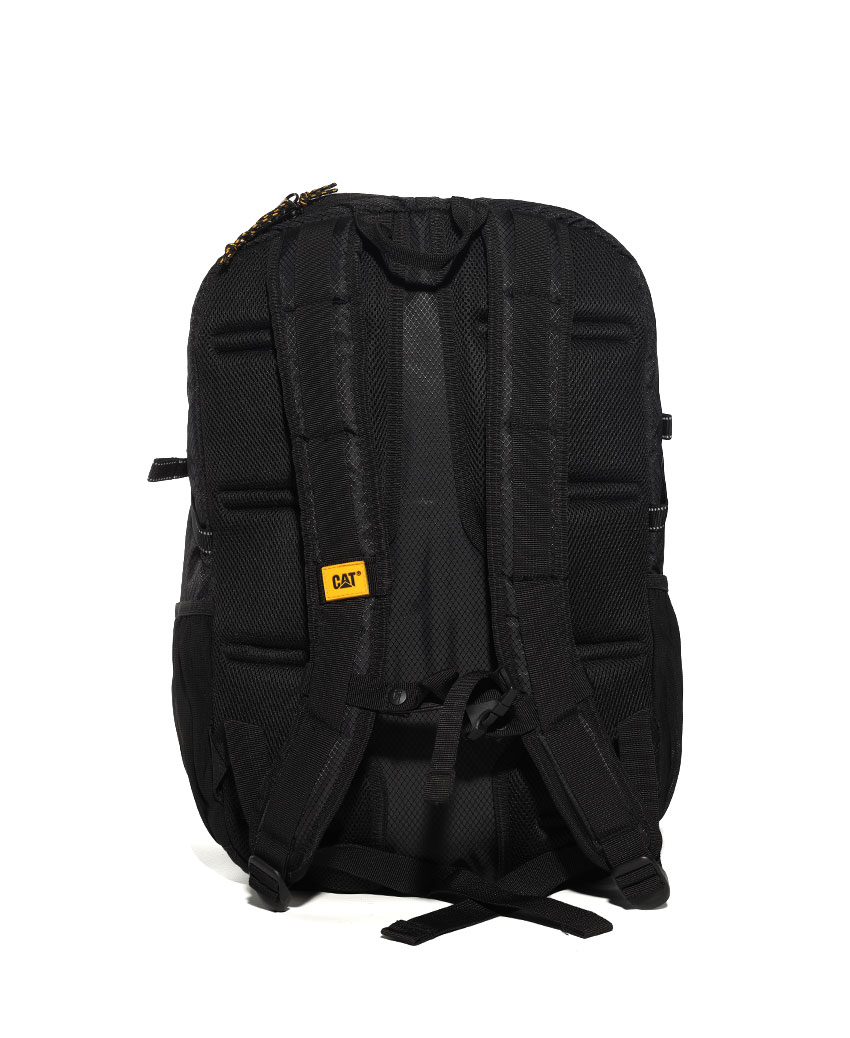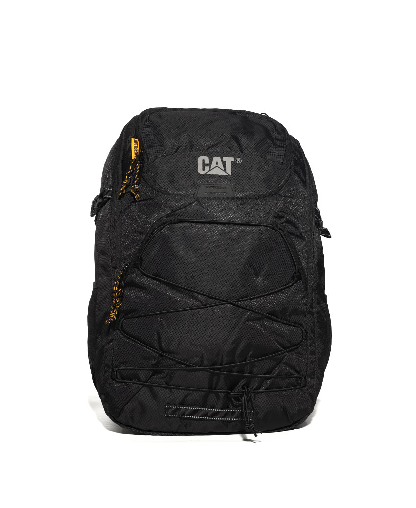 حقيبة كبيرة بجيب رئيسي من الامام و خيوط متقاطع لاضافة تخزين اضافي , مع شعار الكات عاكس للمزيد من الامان , أحزمة كتف هوائية قابلة للتعديل ومبطنة , جيوب جانبية من القماش لزجاجة الماء بلون اسود ممبز