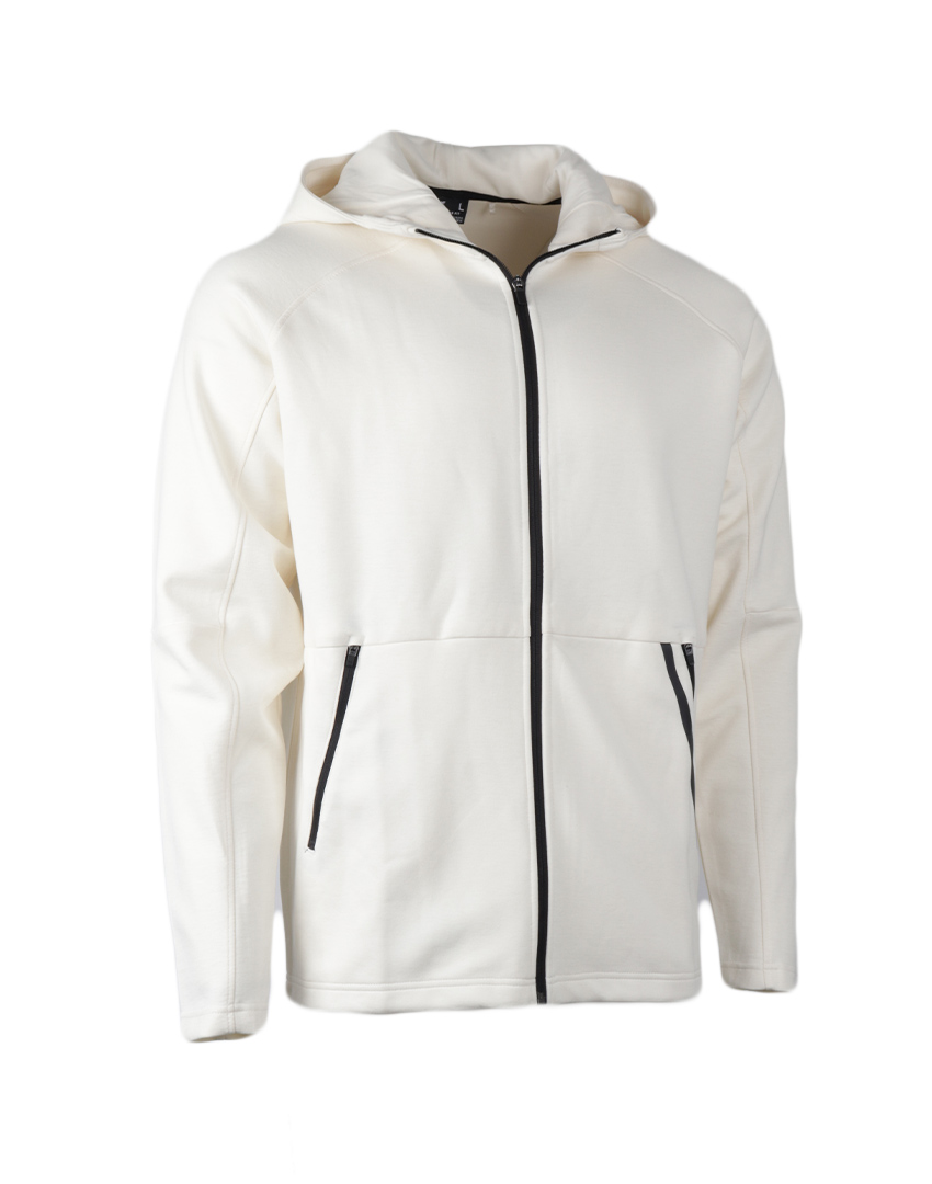 جاكيت من قماش منسوج من البوليستر و الرايون مع نسبة من اليلاستان برنص غير قابل للازالة و اكمام بتفصيلة راغلان و جيبان جانبيان يقفلان بسحاب