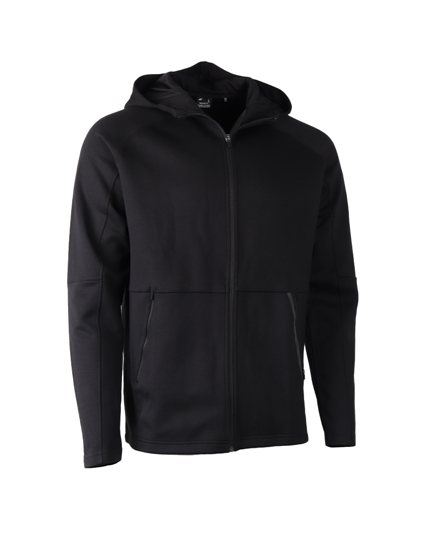 جاكيت من قماش منسوج من البوليستر و الرايون مع نسبة من اليلاستان برنص غير قابل للازالة و اكمام بتفصيلة راغلان و جيبان جانبيان يقفلان بسحاب