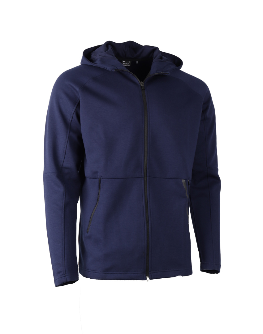 جاكيت من قماش منسوج من البوليستر و الرايون مع نسبة من اليلاستان برنص غير قابل للازالة و اكمام بتفصيلة راغلان و جيبان جانبيان يقفلان بسحاب